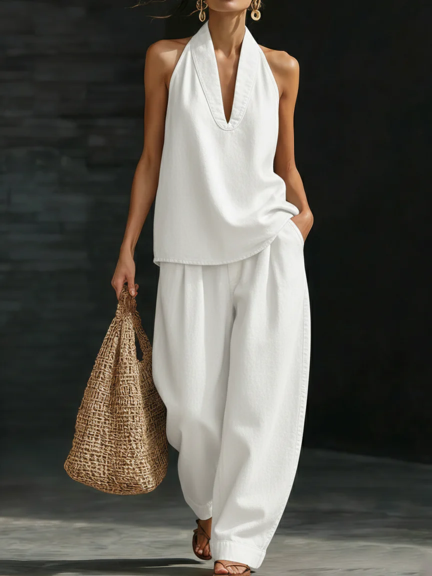 This minimalist and stylish denim V-neck sleeveless top and wide-leg pants set effortlessly creates a fashionable look, ideal for the modern explorer.