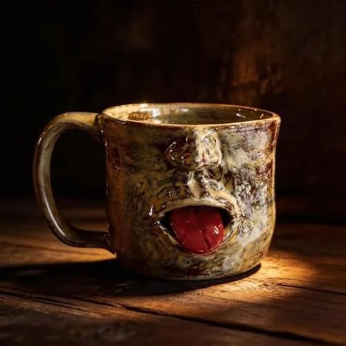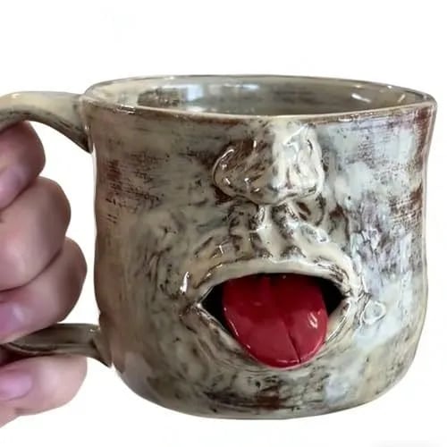 - Features: The mug features a three-dimensional facial structure with a prominent red tongue.